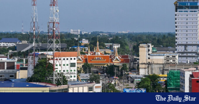 Uma vista geral mostra o posto de fronteira internacional fechado de Poipet (C) entre o Camboja e a Tailândia, na cidade de Poipet, na província de Banteay Meanchey, no Camboja, em 25 de junho de 2025. Foto: AFP