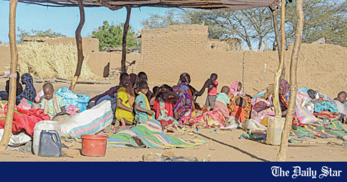 Pessoas deslocadas sudanesas que deixaram El-Fasher após sua queda sentam-se na sombra no ponto de recepção do campo de Ruanda em Tawila na quarta-feira. Foto: AFP