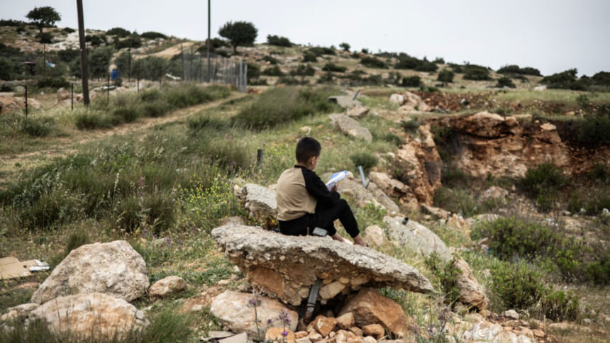 Um garoto lê um livro de texto fora de residências de estudantes vazias usadas por famílias deslocadas como abrigos da Universidade Americana Árabe, fora de Jenin, na Cisjordânia ocupada, em 9 de abril de 2025. Dezenas de milhares de palestinos foram deslocados da margem oeste do norte desde que Israel lançou a parede ofensiva de fércula “em 21 de janeiro na área. Foto: AFP