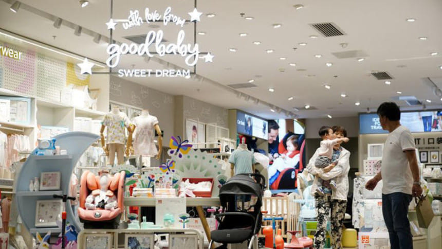 FOTO DE ARQUIVO: Um adulto segurando um bebê caminha em uma loja que vende produtos para bebês em Xangai, China, 1º de junho de 2021. REUTERS/Aly Song/Foto de arquivo