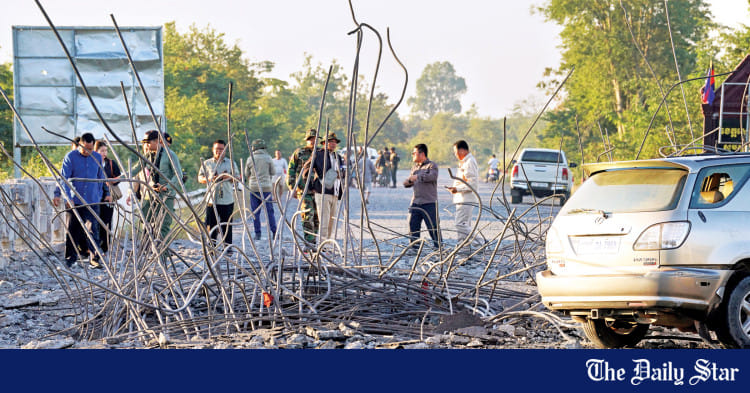 Pessoas olham para uma ponte danificada depois que a Tailândia realizou ataques aéreos em uma área entre as províncias de Oddar Meanchey e Siem Reap, no Camboja, no sábado. Foto: AFP