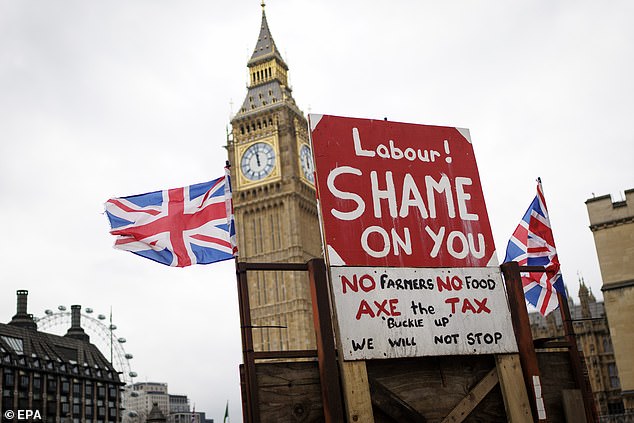 Os resultados do inquérito mostraram que 65 por cento da população pensa que o partido “negligencia injustamente” aqueles que vivem no campo. Na foto: Um cartaz em um protesto de agricultores em Londres no início deste mês, contra as antigas mudanças trabalhistas nas regras de imposto sobre herança