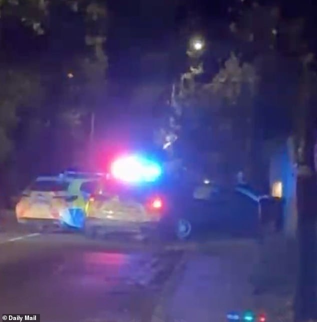 Um vídeo feito por um vizinho próximo mostrou o carro suspeito abandonado estacionado em ângulo reto na entrada de uma propriedade, cercado por carros da polícia com luzes azuis piscando.