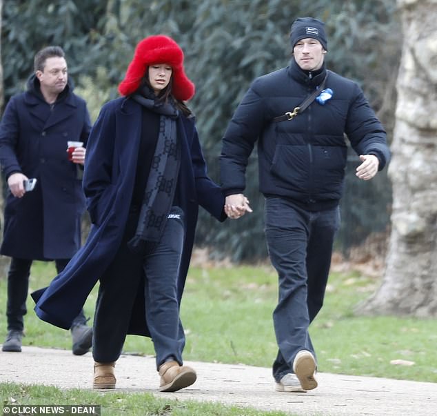 A cantora do hit Physical saboreou um café para viagem enquanto passeava pelo parque com seu futuro marido, que optou por uma jaqueta preta acolchoada