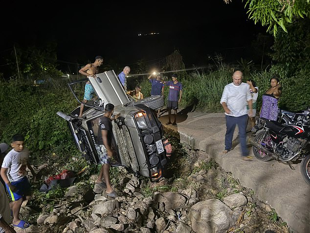 O SUV capotado de Levison Wood depois de saltar 150 pés pela selva