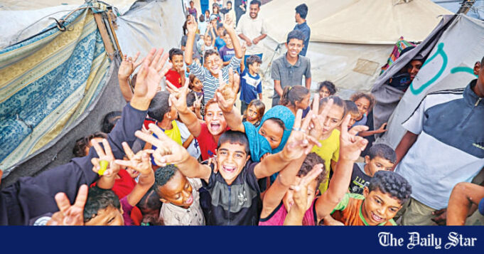 Crianças palestinas comemoram ontem em um campo para deslocados em Nuseirat, no centro da Faixa de Gaza, após a notícia de um novo acordo de cessar-fogo em Gaza. Foto: AFP