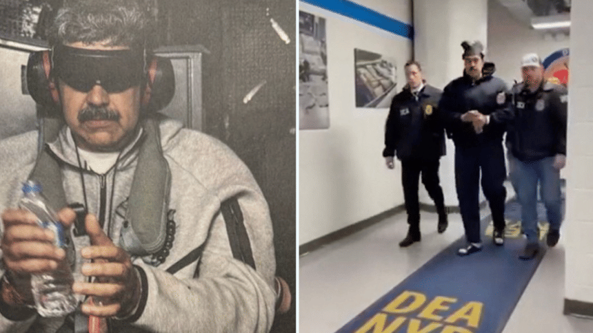 (À direita) Esta captura de tela retirada do relato X do Rapid Response 47, o relato oficial de resposta rápida da Casa Branca, mostra o presidente venezuelano Nicolas Maduro (C) escoltado por agentes da DEA dentro da sede da Administração Antidrogas dos EUA (DEA) em Lower Manhattan, Nova York, em 3 de janeiro de 2026. FOTO AFP / X CONTA DE RESPOSTA RÁPIDA 47