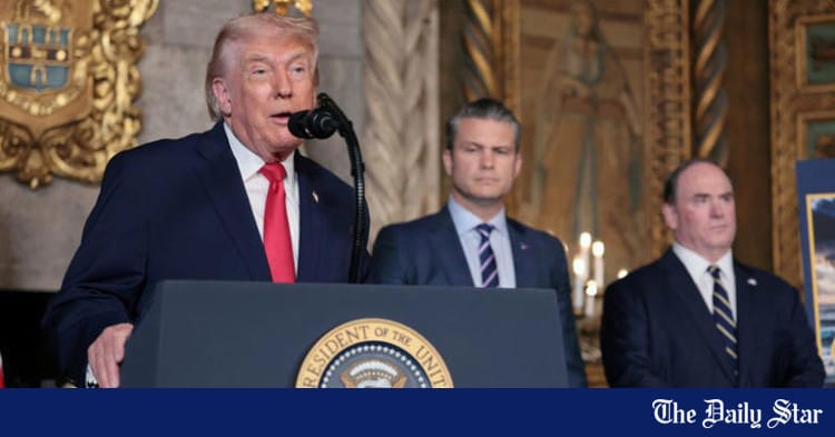 O presidente dos EUA, Donald Trump, faz um anúncio sobre a “Frota Dourada” da Marinha, enquanto o secretário de Defesa Pete Hegseth e o secretário da Marinha John Phelan ouvem, em Mar-a-lago em Palm Beach, Flórida, EUA, 22 de dezembro de 2025. REUTERS/Jessica Koscielniak