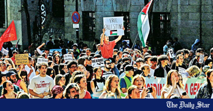 Os estudantes marcharam durante uma greve de estudantes para apoiar os palestinos em Gaza e condenar a interceptação da força israelense dos vasos da flotilha global de Sumud, em Madri, Espanha, ontem. Foto: AFP, Reuters