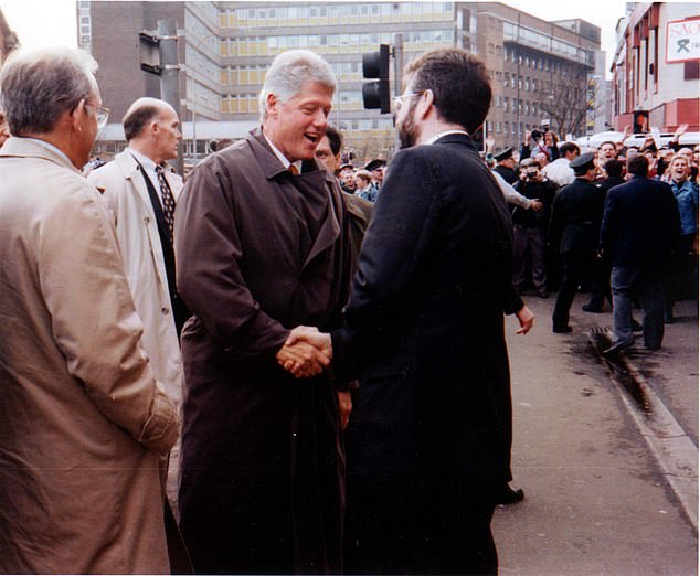 Clinton é fotografado cumprimentando multidões em Belfast em 29 de novembro na mesma viagem, que o viu visitar a República da Irlanda e a Irlanda do Norte