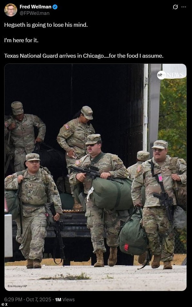 Um comentarista escreveu: ‘Hegseth vai enlouquecer. Estou aqui para isso… Texas A Guarda Nacional chega a Chicago… para buscar a comida, presumo.