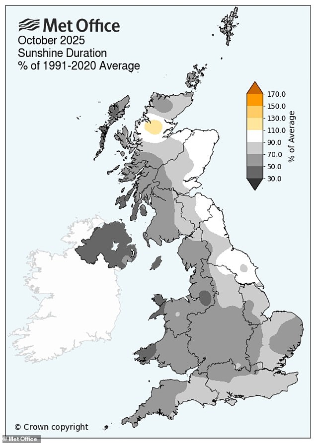 O mês passado foi o outubro mais sombrio em 60 anos, revelou o Met Office. Céus cinzentos persistentes e nuvens baixas significaram que o Reino Unido teve uma média de apenas 63,3 horas de sol durante todo o mês