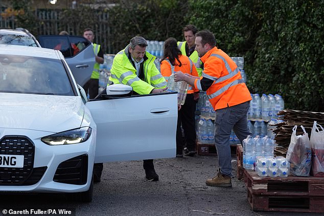 Um trabalhador distribui água engarrafada no Tunbridge Wells Sports Centre em 3 de dezembro