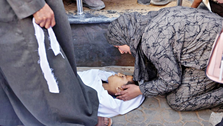 Uma mulher lamenta o corpo de uma criança da família Al-Khour no quintal do hospital al-Shifa depois que a casa foi atingida por uma greve israelense no bairro de Sabra da cidade de Gaza ontem. Foto: AFP