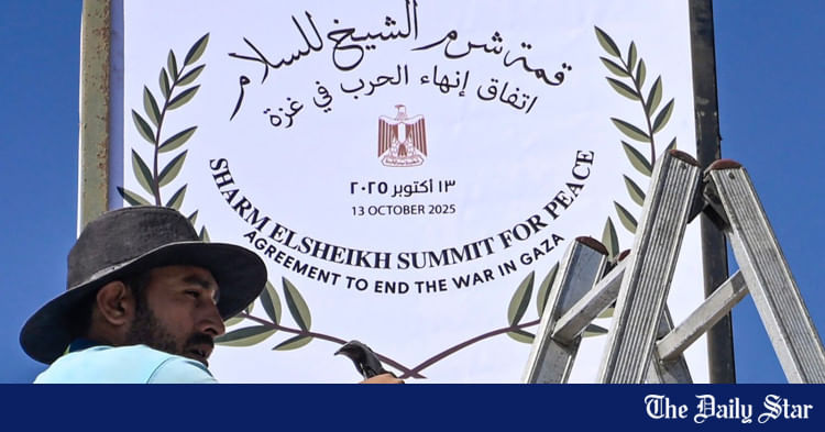 Um funcionário municipal fixa uma placa em Sharm el-Seikh, enquanto a cidade turística egípcia se prepara para sediar uma cúpula de paz em Gaza, mediada pelos EUA, em 12 de outubro de 2025. AFP