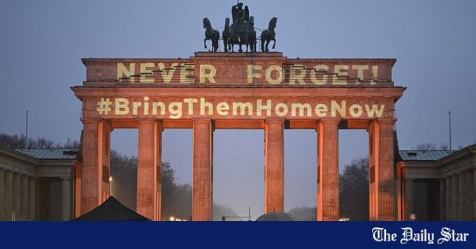O portão iluminado de Brandemburgo é visto com a inscrição ‘Never Forget’ durante um memorial para o enterro dos reféns mortos israelenses da família Bibas em 26 de fevereiro de 2025 em Berlim. A mãe e seus dois filhos foram seqüestrados pelo Hamas em 7 de outubro de 2023. Seus restos mortais foram devolvidos a Israel da Strip Gaza na semana passada como parte de um acordo de cessar -fogo com o Hamas. Foto: AFP