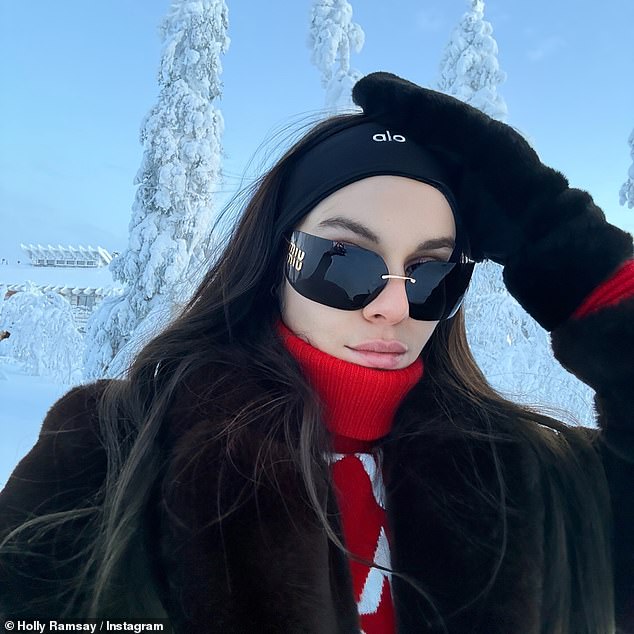 Holly Ramsay fez questão de compartilhar fotos de seu estilo nas pistas enquanto postava uma selfie deslumbrante com seu rosto fazendo beicinho, óculos de sol Miu Miu de £ 233 e uma faixa de cabelo Alo durante as férias em família com seu noivo Adam Peaty, seu filho George e sua família