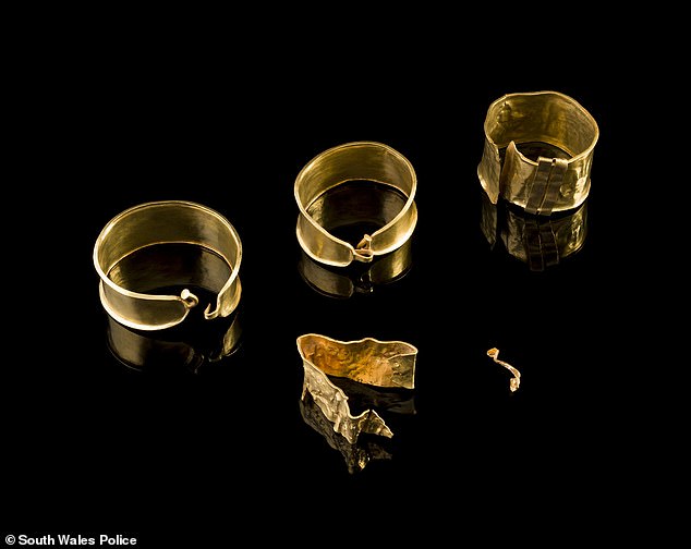 Os itens perdidos incluem quatro braceletes de ouro da Idade do Bronze Médio de Llanwrthwrl, Powys, e uma lúnula de ouro do início da Idade do Bronze, um ornamento em forma de meia-lua usado como colar, de Llanllyfni, Gwynedd.