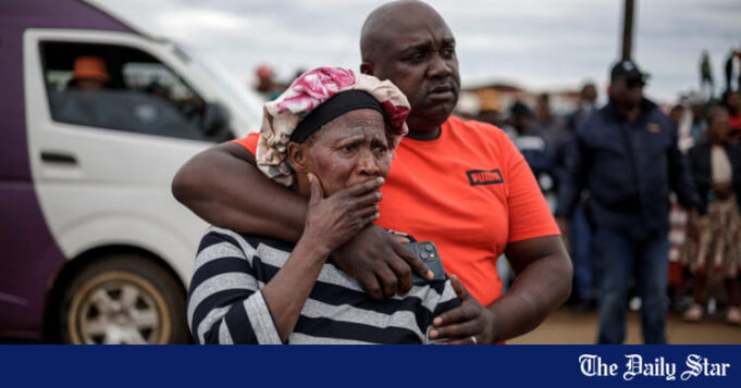 Familiares de uma vítima reagem no local de um ataque em uma taverna em Bekkersdal, em 21 de dezembro de 2025. Foto: AFP
