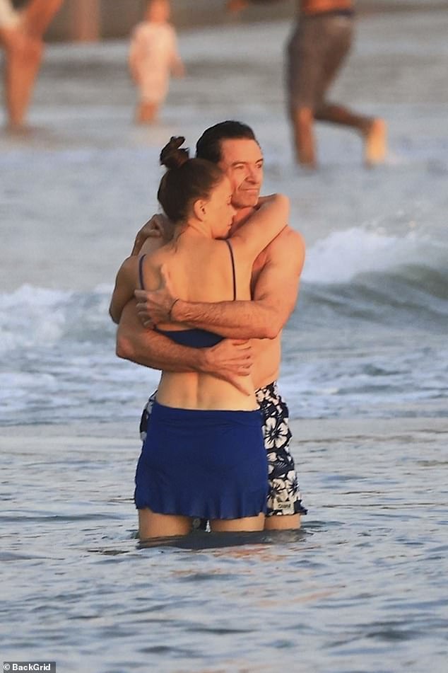 Foster exibiu sua figura tonificada em um maiô azul marinho de duas peças, enquanto Jackman ficou sem camisa em sunga estampada enquanto a dupla aproveitava o pôr do sol durante seu afetuoso passeio à beira-mar.