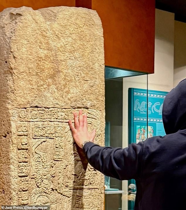 Bad Bunny compartilhou uma foto enquanto visitava o museu do México, mostrando sua mão colocada no que parecia ser uma antiga laje de pedra maia.
