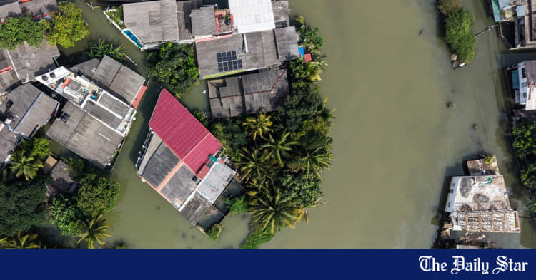 Uma vista aérea mostra casas parcialmente submersas nas enchentes após fortes chuvas após o ciclone Ditwah em Wellampitiya, nos arredores de Colombo, em 3 de dezembro de 2025. AFP