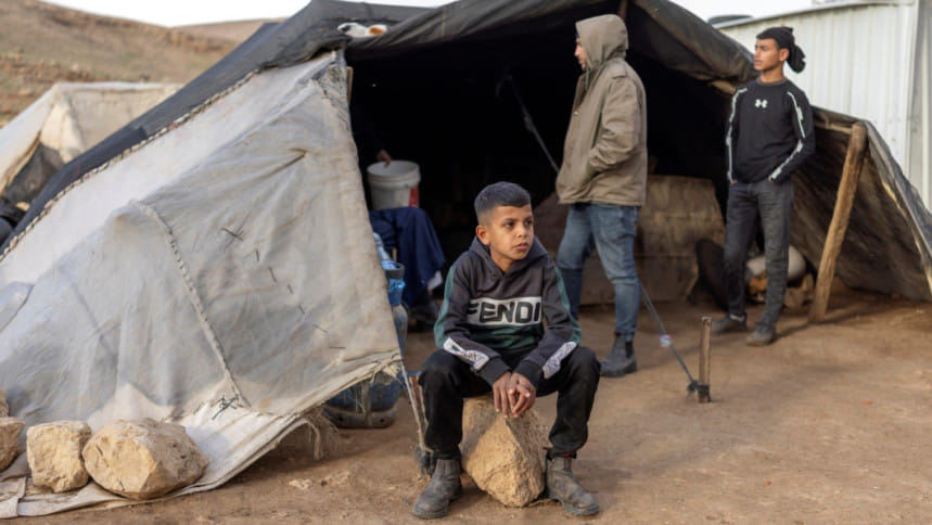 Homens beduínos palestinos se reúnem em uma tenda com vista para um posto avançado de colonos de direita israelense recém-construído, erguido dentro das terras de uma comunidade beduína de Ras Ein al-Auja, perto da cidade de Jericó, na Cisjordânia palestina ocupada por Israel, em 1º de janeiro de 2026. Foto: AFP