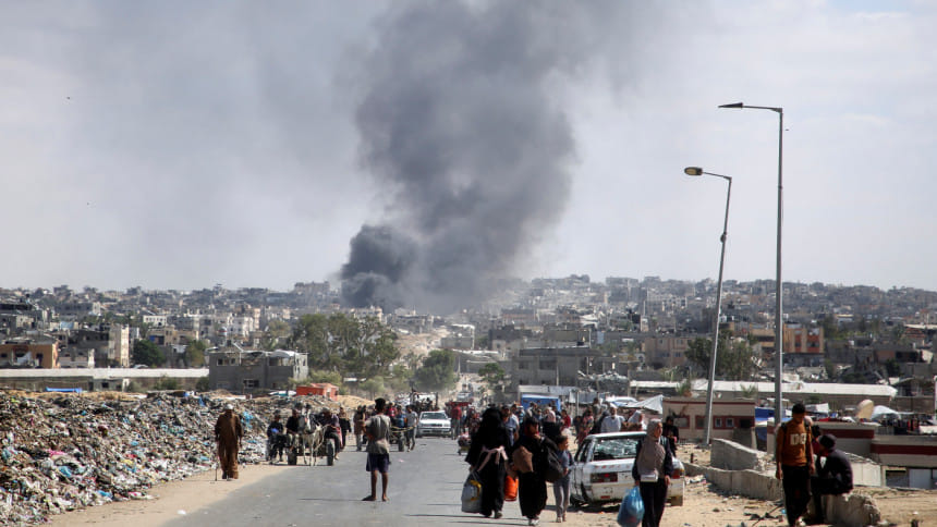 A fumaça sobe após um ataque israelense enquanto palestinos deslocados fogem de áreas na parte oriental de Khan Younis após uma ordem de evacuação israelense, em meio ao conflito em curso entre Israel e o Hamas, em Khan Younis, no sul da Faixa de Gaza, em 7 de outubro de 2024. Foto: Reuters/Hatem Khaled