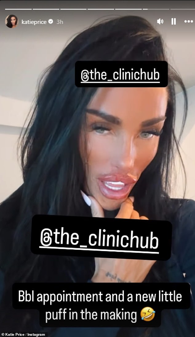 Ela disse aos seguidores que estava amando seus ‘novos lábios beijáveis’ antes de afirmar que se submeteria a um lifting de bunda brasileiro (BBL) na próxima semana e a uma cirurgia íntima sem nome.