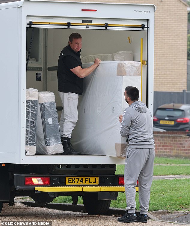 A ex -estrela do aprendiz Thomas Skinner descarrega um colchão da parte de trás de uma van em Essex