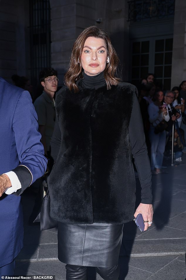 Linda Evangelista Olhei para trás para sua supermodelo melhor quando ela saiu em Paris na noite de quarta -feira – depois de revelar que ainda precisa de terapia para olhar no espelho depois de sua cirurgia plástica ‘mal feita’.