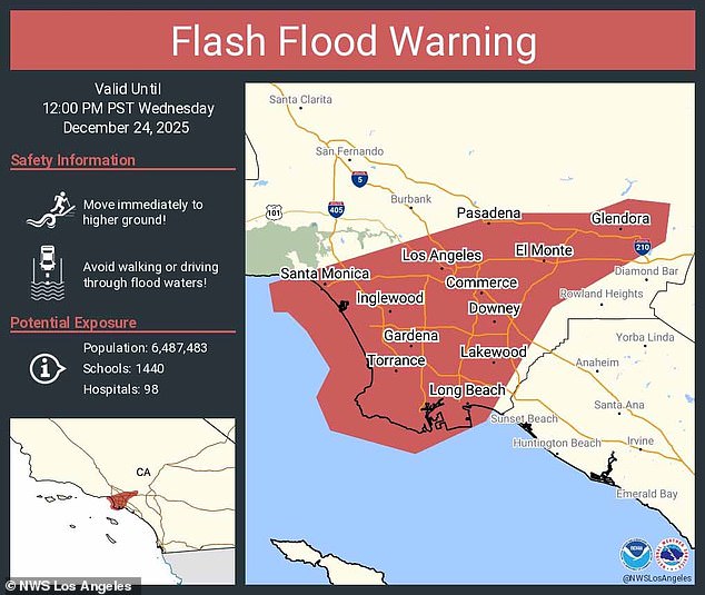 Espera-se que Los Angeles seja especialmente atingida pelas tempestades de inverno que se aproximam, com um alerta de enchentes severas em vigor para a área até as 12h de quarta-feira. Centenas de residentes em bairros de risco foram avisados para ‘mudar-se imediatamente para terrenos mais elevados’