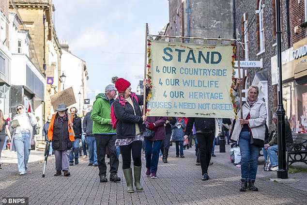 Uma multidão louca marcharam em protesto contra planos controversos de construir quase 4.000 casas no campo que uma vez inspiraram Thomas Hardy.