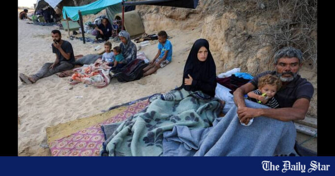 Nancy Abu Matroud se abriga por uma beira da estrada com seu marido Faraj al Ghalayni e sua filha Etra, na faixa central de Gaza. (Reuters)