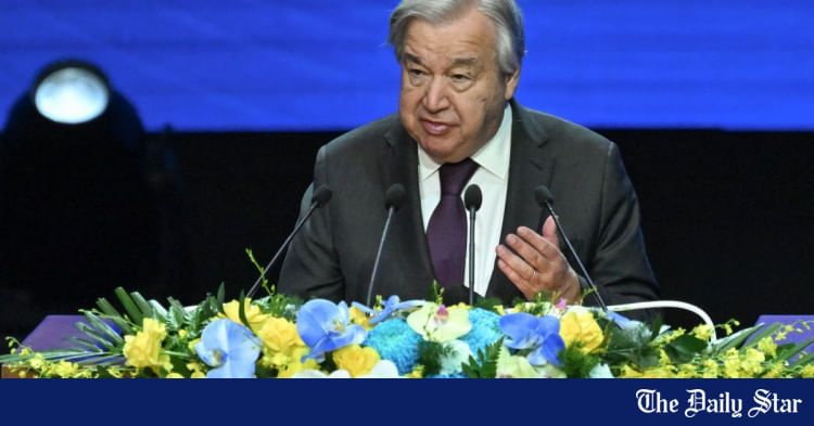 O secretário-geral das Nações Unidas, Antonio Guterres, fala durante a Cerimônia de Assinatura e Conferência de Alto Nível da Convenção das Nações Unidas contra o Crime Cibernético no Centro Nacional de Convenções em Hanói, em 25 de outubro de 2025. Foto: AFP