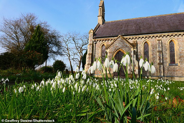 O sombrio feitiço sombrio do Reino Unido está chegando ao fim, pois as temperaturas são definidas para subir a 16 ° C até o final da semana (foto: Snowdrops sob o sol de boas -vindas no antigo cemitério de igreja como parte da igreja de All Saint em Oxfordshire)