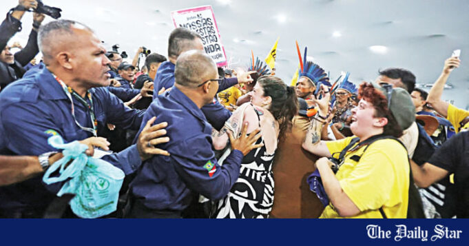 Gritando com raiva, os manifestantes exigiram acesso ao complexo da ONU onde milhares de delegados de países de todo o mundo participam na cimeira climática da ONU deste ano, na cidade amazónica de Belém, Brasil.