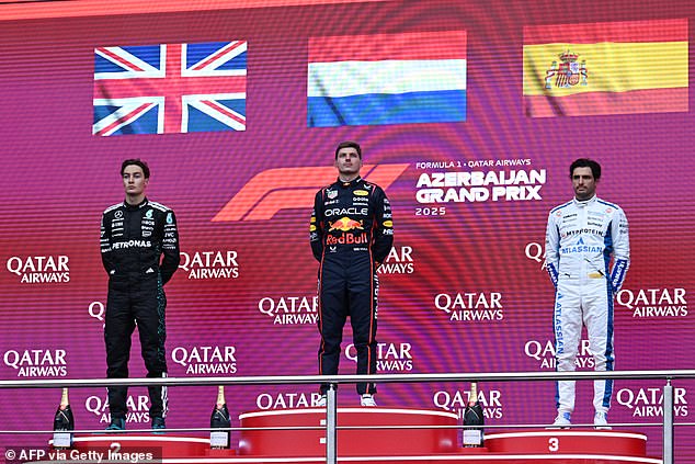 Max Verstappen fica com orgulho enquanto é ladeado por George Russell e Carlos Sainz