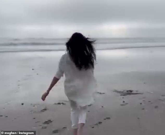 No clipe, a mãe de dois filhos pode ser vista caminhando em direção à costa da praia perto de Montecito – em um clipe que se acredita ter sido filmado por Príncipe Harry.