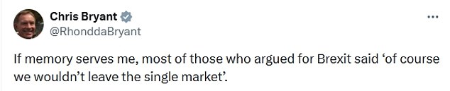 Mas os números trabalhistas pró-UE estavam exultantes. Em resposta a Farage, o Ministro do Comércio, Chris Bryant, disse: “Se não me falha a memória, a maioria dos que defenderam o Brexit disseram: “é claro que não abandonaríamos o mercado único”.