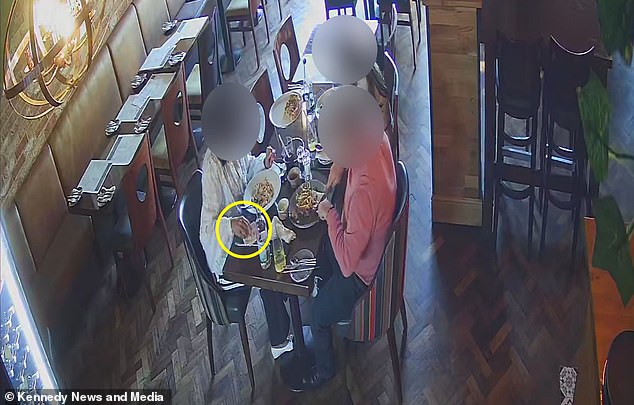 Os funcionários então verificaram as imagens do CCTV do restaurante e ficaram chocados ao testemunhar o homem puxando o grupo de vidro do bolso e passando para seu parceiro para colocar em seu guardanapo.
