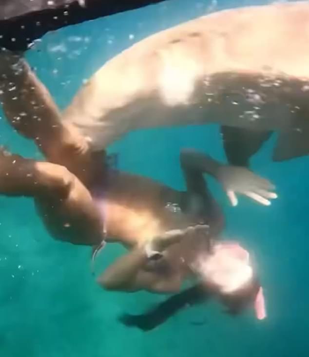 A filmagem mostra vários tubarões nadando ao redor de Tayane Dalazen antes que um tubarão-lixa de repente morda sua perna, agarrando-se por alguns segundos enquanto o homem de 36 anos se debate tentando combatê-lo.