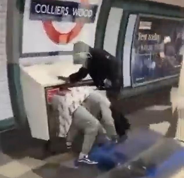 Um dos homens está no chão enquanto dois jovens o atacam na plataforma do metrô em Colliers Wood, no sul de Londres.
