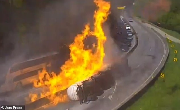 Etanol derrama do caminhão e é imediatamente aceso, pois 25 veículos estão presos atrás