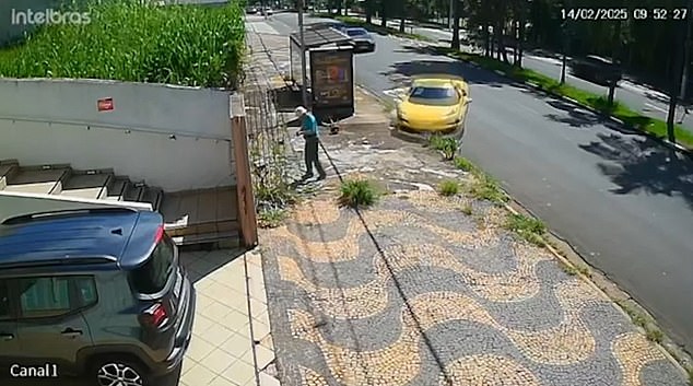 As imagens de CCTV mostram o motorista perdendo o controle do supercarro amarelo e esmagando a parede.