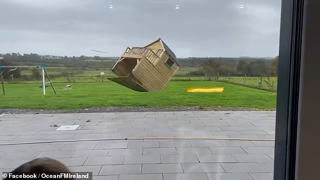 Este é o momento em que uma casa de brincadeira foi içada do chão e arrastada pelo jardim, quando ventos de 100 mph agitados do Reino Unido.