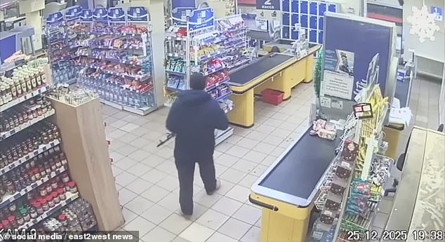 As imagens mostram o momento surpreendente em que um homem armado com um rifle de assalto AK-47 começou a atirar em um supermercado ucraniano.