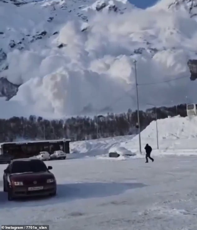 Pessoas assistiram com horror de um estacionamento no Elbrus Resort em Kabardino-Balkaria enquanto a avalanche se dirigia diretamente para eles