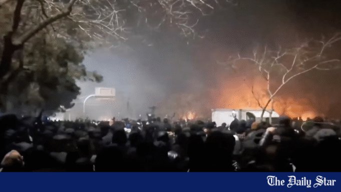 Em imagens da cidade de Mashhad, no nordeste, é possível ver fumaça subindo para o céu noturno devido a incêndios nas ruas, manifestantes mascarados e uma estrada repleta de escombros, mostrou outro vídeo postado no sábado. Explosões podiam ser ouvidas.