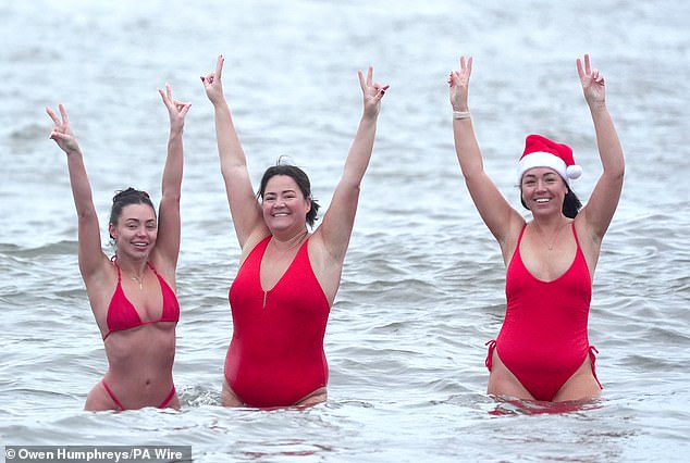Os corajosos Geordies em trajes de banho vermelhos e chapéus de Papai Noel mergulharam no mar em North Tyneside e nadadores em Helen’s Bay em County Down Irlanda do Nortetambém enfrentou as ondas de frio.